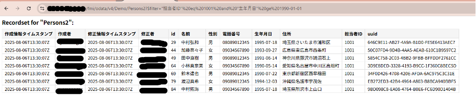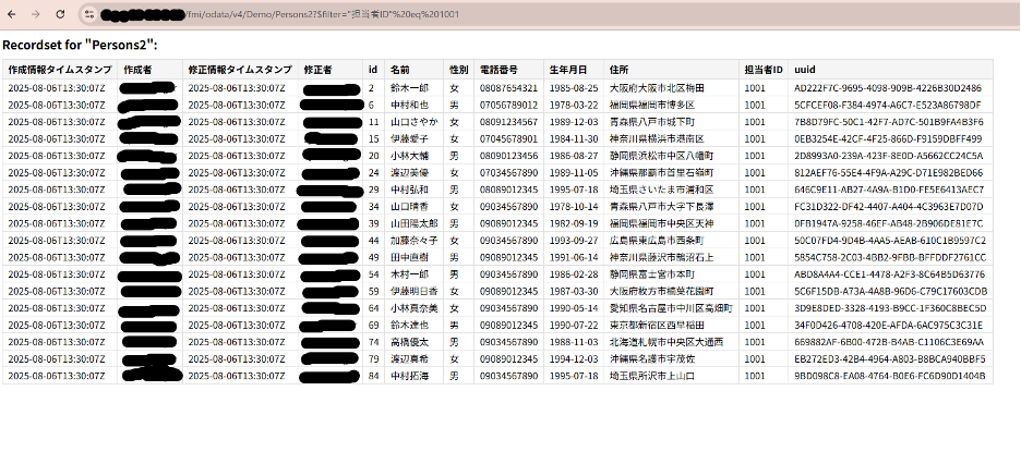 https://xxxx.xxxx.xxx/fmi/odata/v4/Demo/Persons2?$filter=”担当者ID” eq 1001