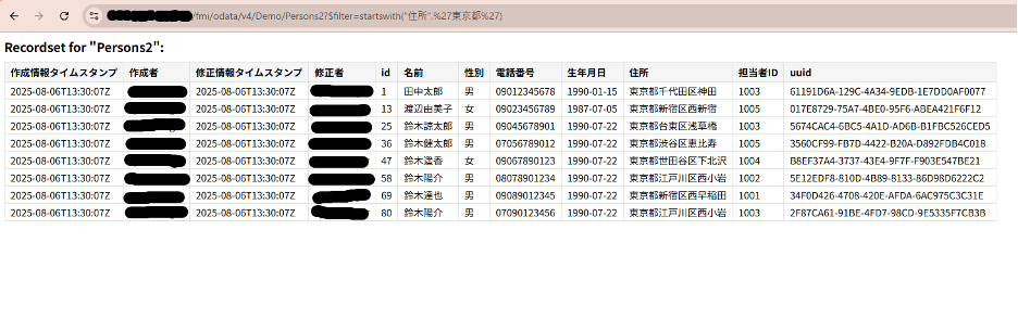 https://xxxx.xxxx.xxx/fmi/odata/v4/Demo/Persons2?$filter=startswith(“住所”, ‘東京都’)