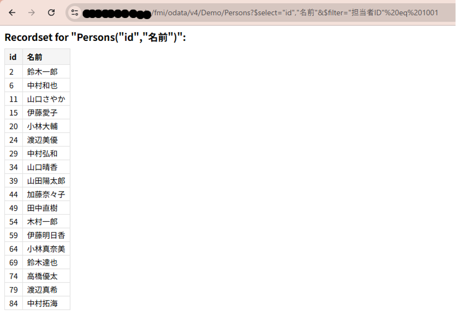 https://xxxx.xxxx.xxx/fmi/odata/v4/Demo/Persons?$select=”id”,”名前”&$filter=”担当者ID” eq 1001