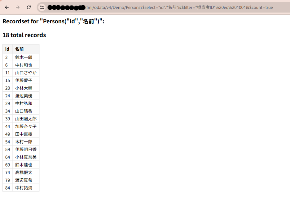 https://xxxx.xxxx.xxx/fmi/odata/v4/Demo/Persons?$select=”id”,”名前”&$filter=”担当者ID” eq 1001&$count=true
