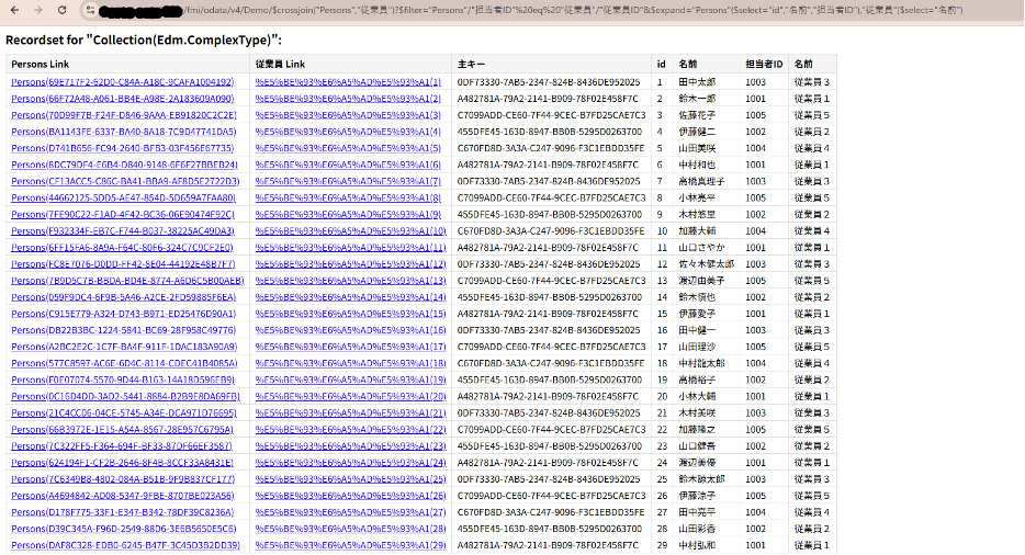https://xxxx.xxxx.xxx/fmi/odata/v4/Demo/$crossjoin(“Persons”,”従業員”)?$filter=”Persons”/”担当者ID” eq “従業員”/”従業員ID”&$expand=”Persons”($select=”id”,”名前”,”担当者ID”),”従業員”($select=”名前”)